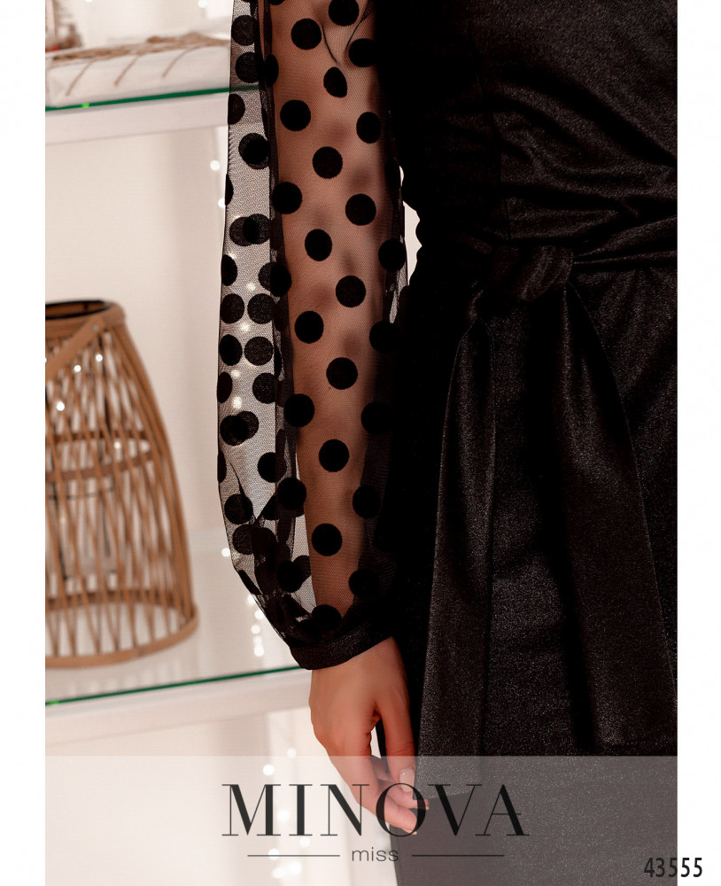 Стильное платье с поясом и полупрозрачными рукавами с небольшими прорезиненными манжетами. Подшито на запАх, по бокам - врезные карманы, застёжка - молния, вшитая по спинке. Силуэт приталенный, сзади на подоле шлица. Ткань с люрексом.