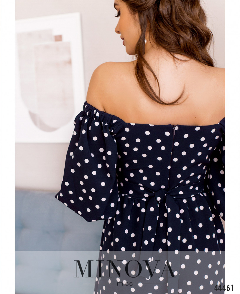 Женственное платье с вырезом горловины "фигурное каре", рукава на плечах придерживаются с помощью вшитой резинки. Рукав свободный, на манжете присобран резинкой. Застёжка - вшитая по спинке молния. Подол отрезной, ниспадает мягкими оборками. Карманов нет. На груди продольные вытачки от плеча до талии. В комплекте пояс в тон.