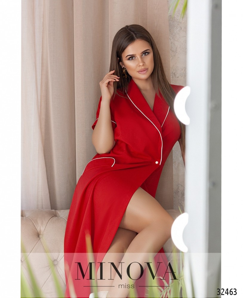 Торжество минимализма, удобства и сексуальности представляет в новой модели платья Minova. Совершенно прямой крой компенсируется запАхом на груди. Застёгивается эта необычная модель всего на одну пуговицу на талии, в то время как подол доходит до середины икры. Ещё несколько «фишек»: рукава с подворотами и контрастной окантовкой (такой же, как и на запАхе), и декоративные клапаны кармашков, к тому же перевёрнутые вверх ногами. Точно можно сказать: ничего подобного у твоих подруг в гардеробе нет! А носить можно с самыми удобными кроссовками или кедами, хоть на пляж, хоть на прогулку. Какой цвет ты выберешь: страстный красный, нежный пудровый или строгий чёрный или синий? Вне зависимости от выбора ты будешь выглядеть сногсшибательно!