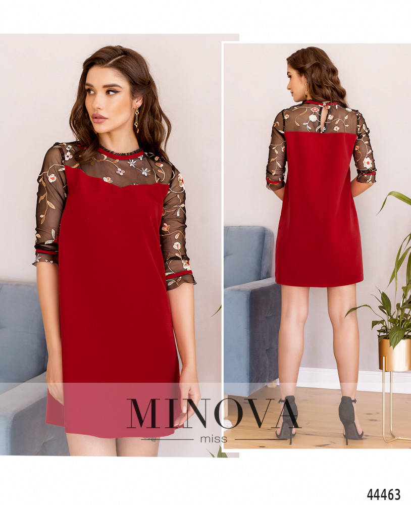 Привлекательное и яркое платье, верх лифа спереди и по спинке, а также рукава - из полупрозрачной сеточки с вышивкой. Рукава со вшитыми в манжеты контрастными резинками. Карманов нет, застёжка - пуговка сзади под шеей.
