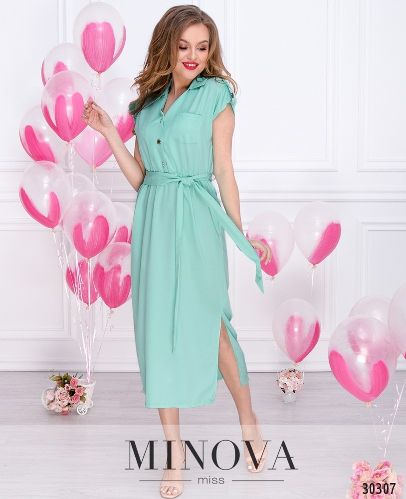 Платье-рубашка в нежных пастельных оттенках. Платье прямого кроя с высокими боковыми разрезами. Лиф с отложным воротником застегивается на пуговицы. Короткие рукава украшены планкой с пуговицей. Талия изготовлена с поясом-резинкой. Подол дополнен накладными карманами.