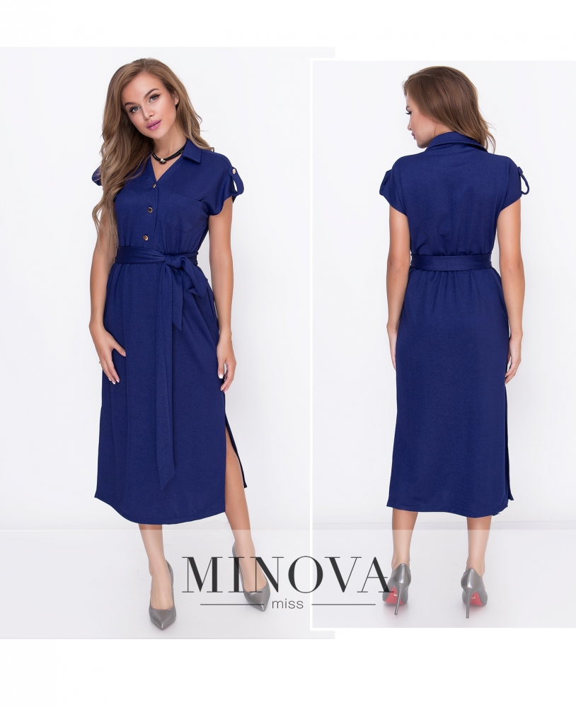 Миди- платье в стиле милитари с короткими рукавами, отложным воротником и съемным поясом. Лиф платья застегивается на три пуговицы и украшен нагрудным карманом. Короткие рукава оформлены планкой с пуговицей. Отрезной подол на резинке дополнен карманами и двумя разрезами вдоль боковых швов. Платье без молнии.