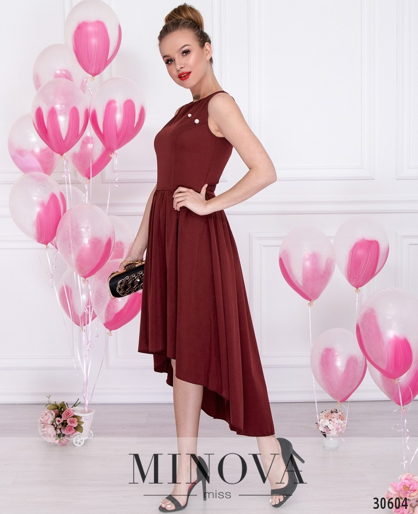 Воздушное платье с разно уровневым подолом. Отрезной лиф без рукавов украшен брошью с бусинами. Расклешенный подол собран в складки и укорочен на лицевой стороне. На спине платье застегивается на фактурную молнию.
