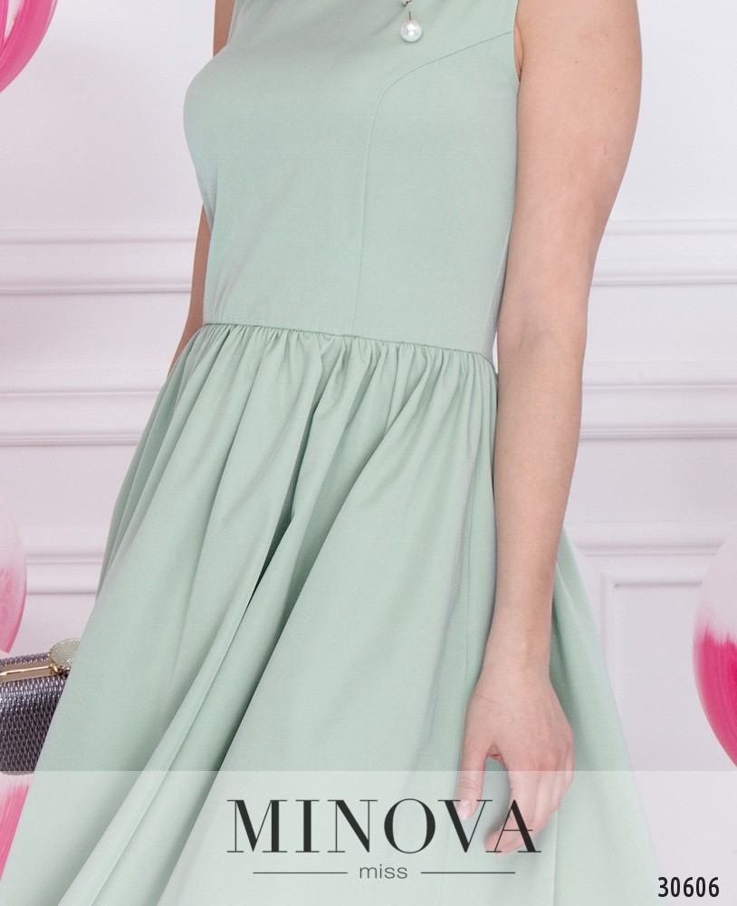 Воздушное платье с разно уровневым подолом. Отрезной лиф без рукавов украшен брошью с бусинами. Расклешенный подол собран в складки и укорочен на лицевой стороне. На спине платье застегивается на фактурную молнию.