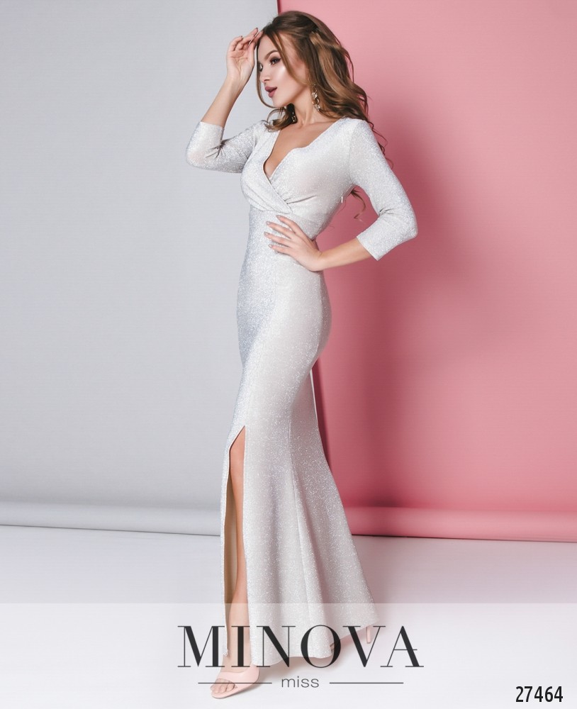 Роскошное макси-платье с глубоким декольте с запАхом и высоким разрезом. Платье из мерцающего люрекса прекрасно демонстрирует фигуру, выгодно подчеркивая достоинства. Отрезной лиф с рукавами ¾ немного драпируется по линии завышенной талии. Подол, расширяющийся к низу, дополнен разрезом на лицевой стороне. Платье застегивается на боковую скрытую молнию.