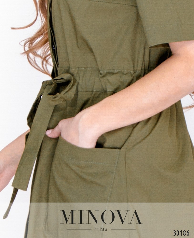 Платье-рубашка в стиле «сафари» с асимметричным подолом. Платье полностью застегивается на пуговицы на лицевой стороне. Талия регулируется вшитым поясом-кулиской и завязывается на лицевой стороне. Подол дополнен накладными карманами.