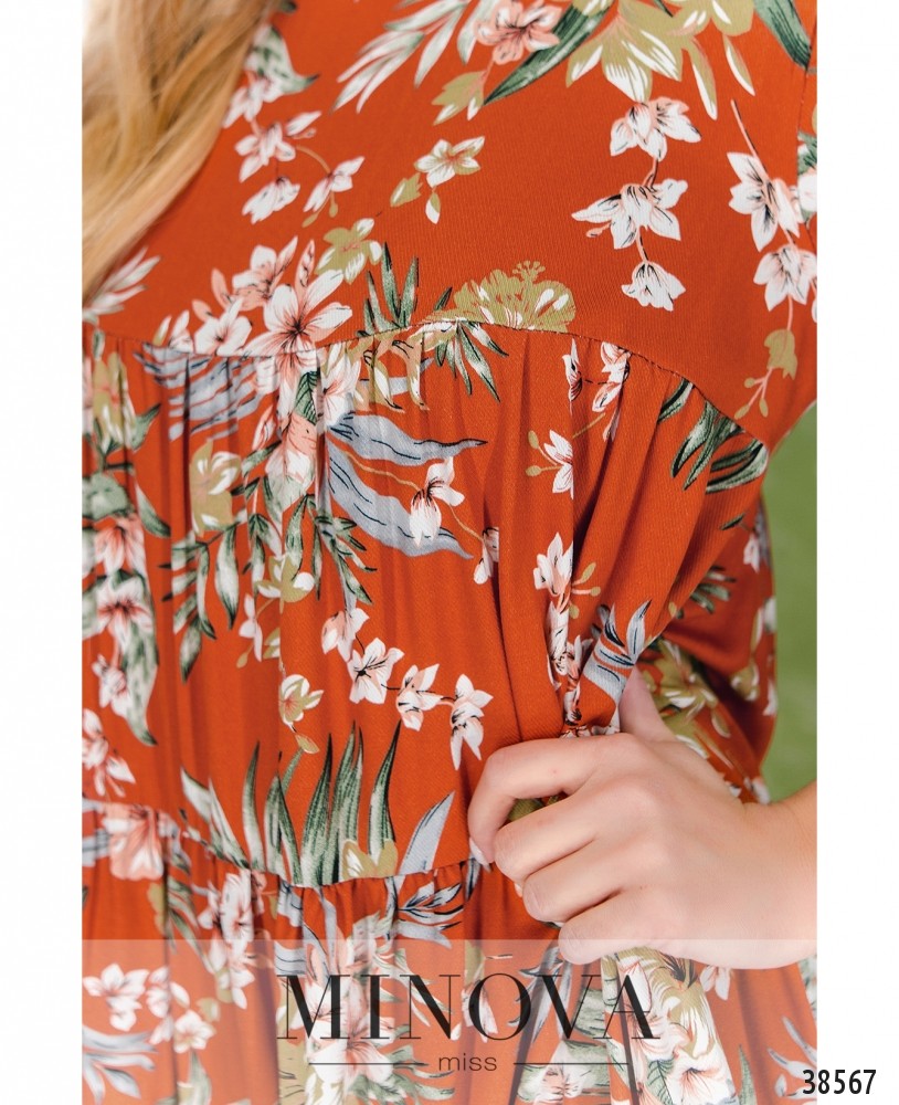 Яркое летнее платье с подкладкой, сверху - лёгкая ткань, присобранная оборками. В рукава на запястьях вшиты резинки. Застёжек и карманов нет, вырез горловины "лодочка".