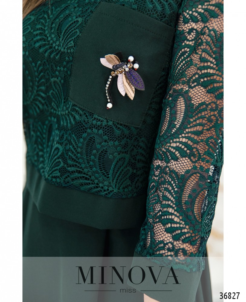 Нарядное платье с нежным кружевом из новой коллекции Minova станет прекрасным выбором для праздника или более официального торжественного мероприятия. Платье из мягкой ткани, сверху подшита кружевная накидка длиной до талии, укреплённая плотным манжетом снизу. Рукава длиной 3/4 также с небольшими манжетами, полностью кружевные, без подкладки. На груди и на нижней, и на верхней ткани – небольшие вытачки. Сверху справа располагается гладкий кармашек с брошью в виде стрекозы. На платье по бокам врезные карманы, застёжки на платье отсутствуют, вырез горловины полукруглый, широкий. Подол по спинке немного длиннее. Длина платья миди, поэтому стоит выбирать обувь на танкетке или каблуке любой высоты. Украшение входит в комплект.