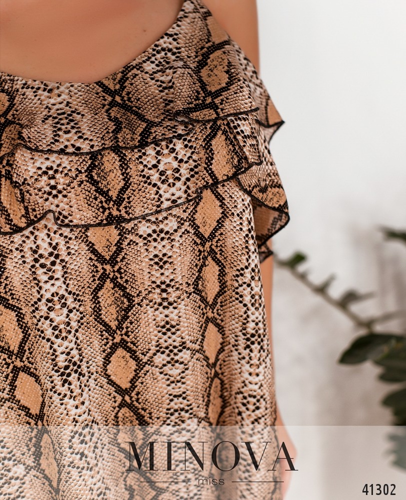 Яркое лёгкое летнее платье без застёжек и карманов, удерживается на тонких лямках, которые перекрещиваются по спинке. Верх украшен двумя рядами мягких оборок.