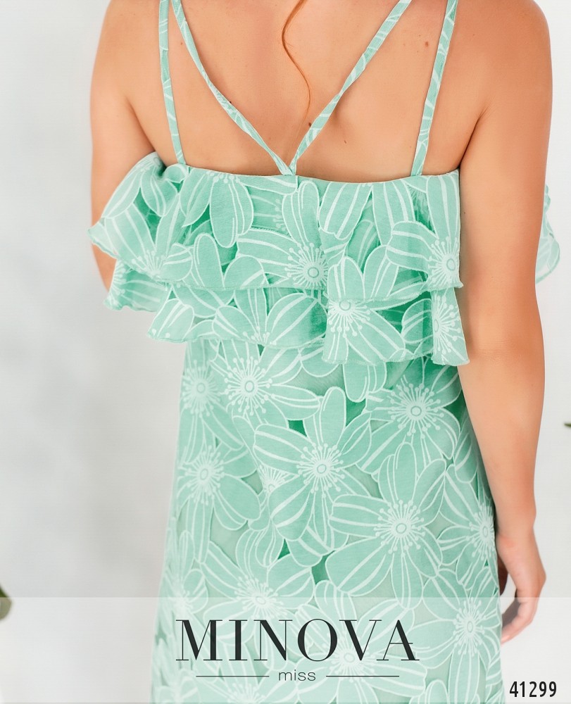 Яркое лёгкое летнее платье без застёжек и карманов, удерживается на тонких лямках, которые перекрещиваются по спинке. Верх украшен двумя рядами мягких оборок.