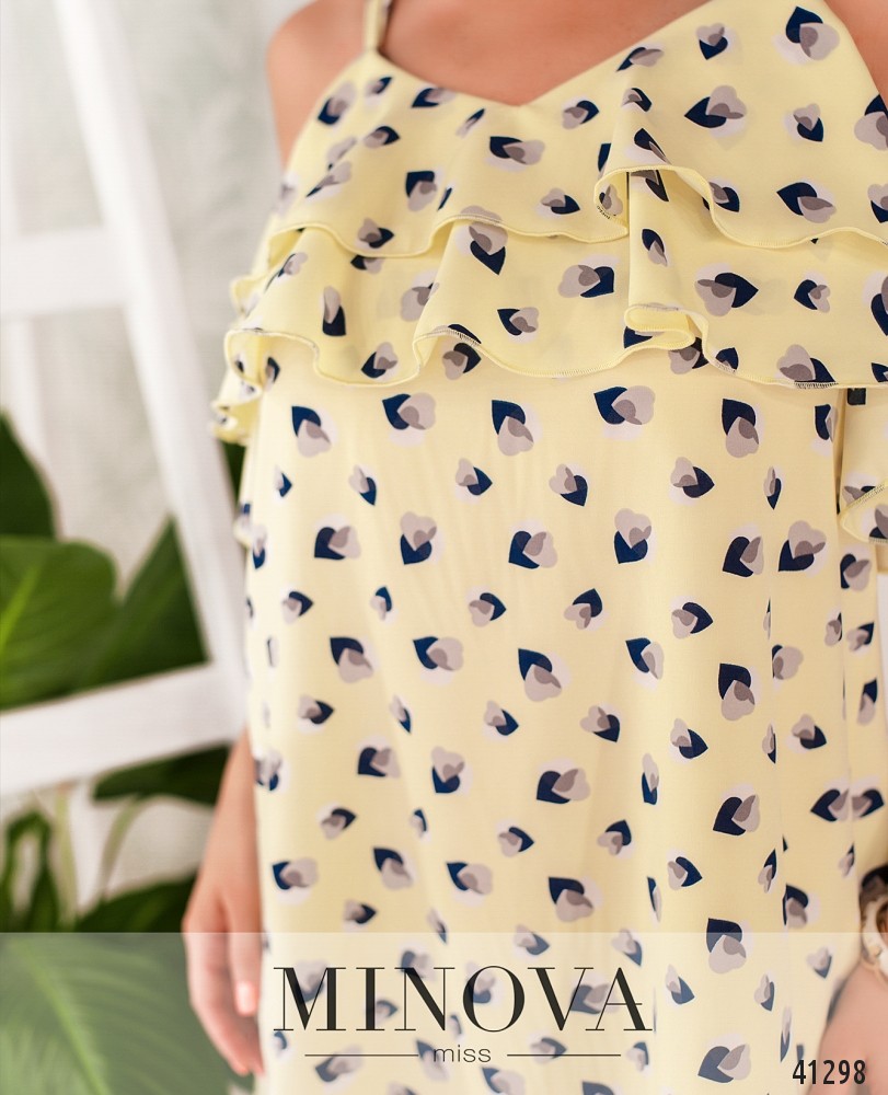 Яркое лёгкое летнее платье без застёжек и карманов, удерживается на тонких лямках, которые перекрещиваются по спинке. Верх украшен двумя рядами мягких оборок.