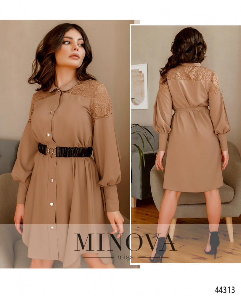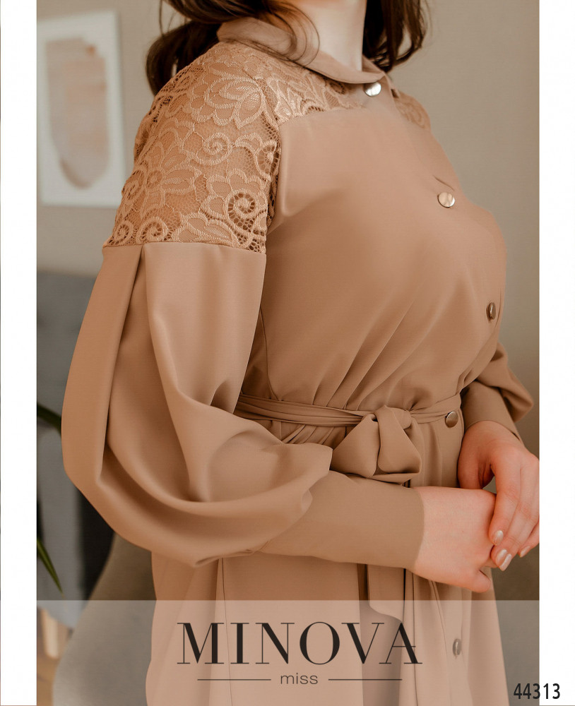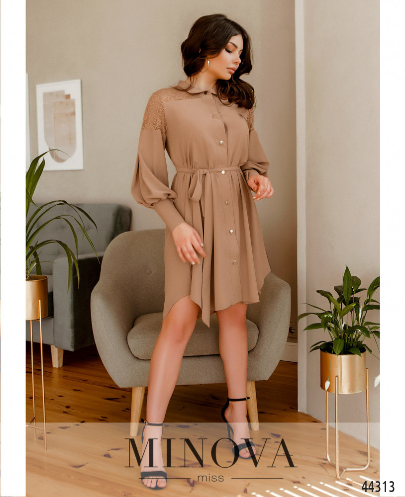 Элегантное платье-рубашка, украшенное кружевом на плечах спереди и по спинке. Карманов нет, застёжка - ряд пуговиц спереди на планке, от воротничка до низу. Рукава с удлинёнными манжетами, на них по одной пуговке. В комплекте пояс в тон.