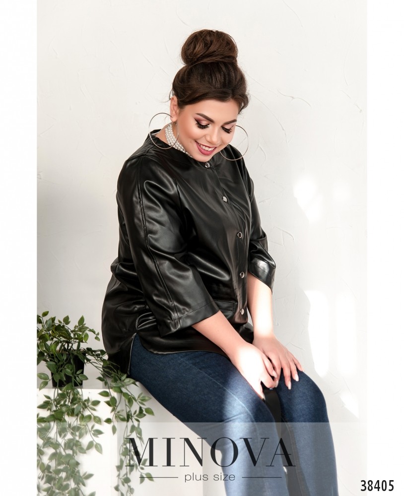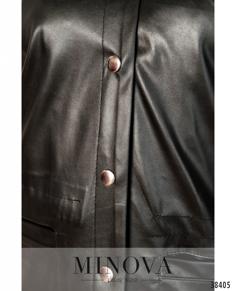 Стильная куртка большого размера с декоративными клапанами, застёгивается на ряд кнопок по центру, вырез горловины полукруглый, в пояс вшит шнурок, который завязывается изнутри. Рукава без манжет.