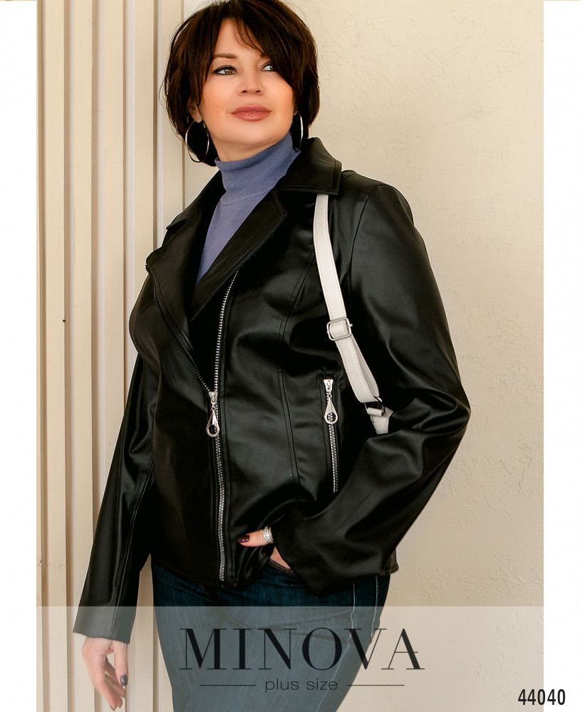 Стильная и актуальная куртка фасона "косуха", с диагональной молнией и резными лацканами. По бокам - прорезные карманы под молнией. Рукава без манжет. С мягкой подкладкой.