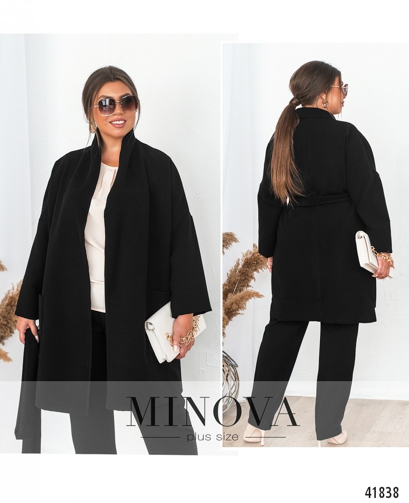 Мягкое пальто-кардиган батал без застёжек, с поясом. По бокам - накладные карманы. Подол асимметричный, по спинке длиннее, спереди короче. Рукава без манжет. Подкладки нет.