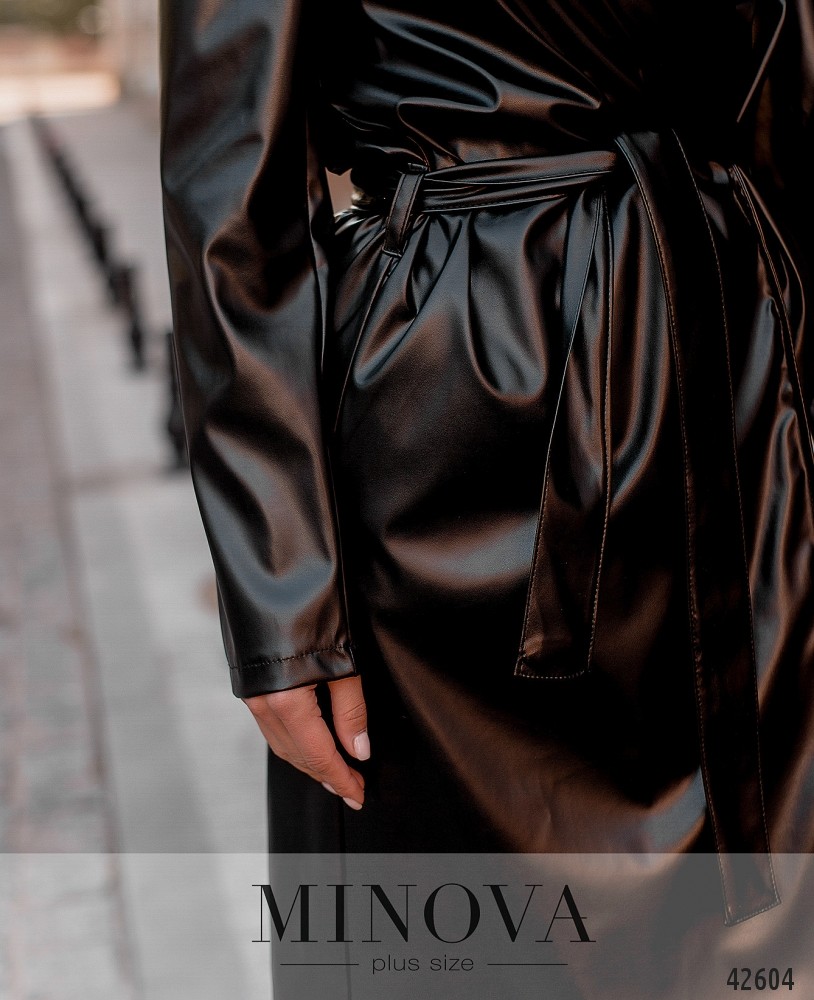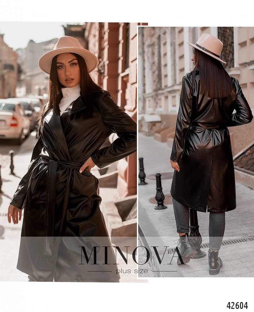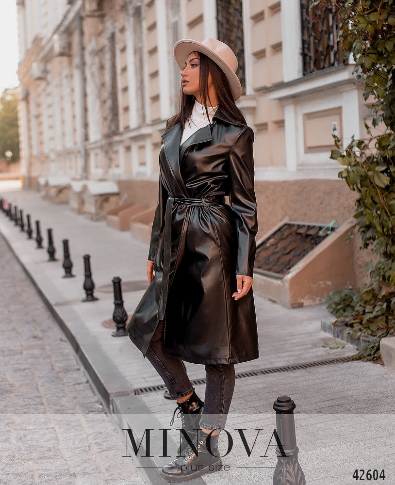 Стильный плащ большого размера без подкладки, без застёжек, с поясом - на талии две шлейки для него. Рукава без манжет. Лацканы резные. На подоле сзади длинная шлица. По бокам - врезные карманы.