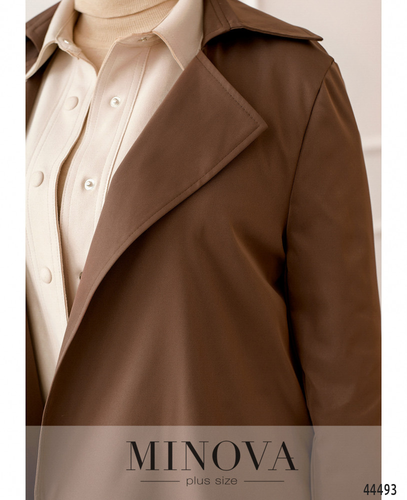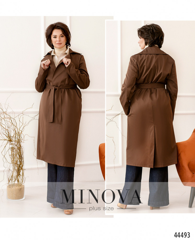 Привлекательный минималистичный плащ без подкладки и без застёжек, сзади на подоле большая шлица. На поясе по бокам шлейки. Лацканы резные, с широкими отворотами, воротник отложной. Пояс/аксессуар входит в комплект.