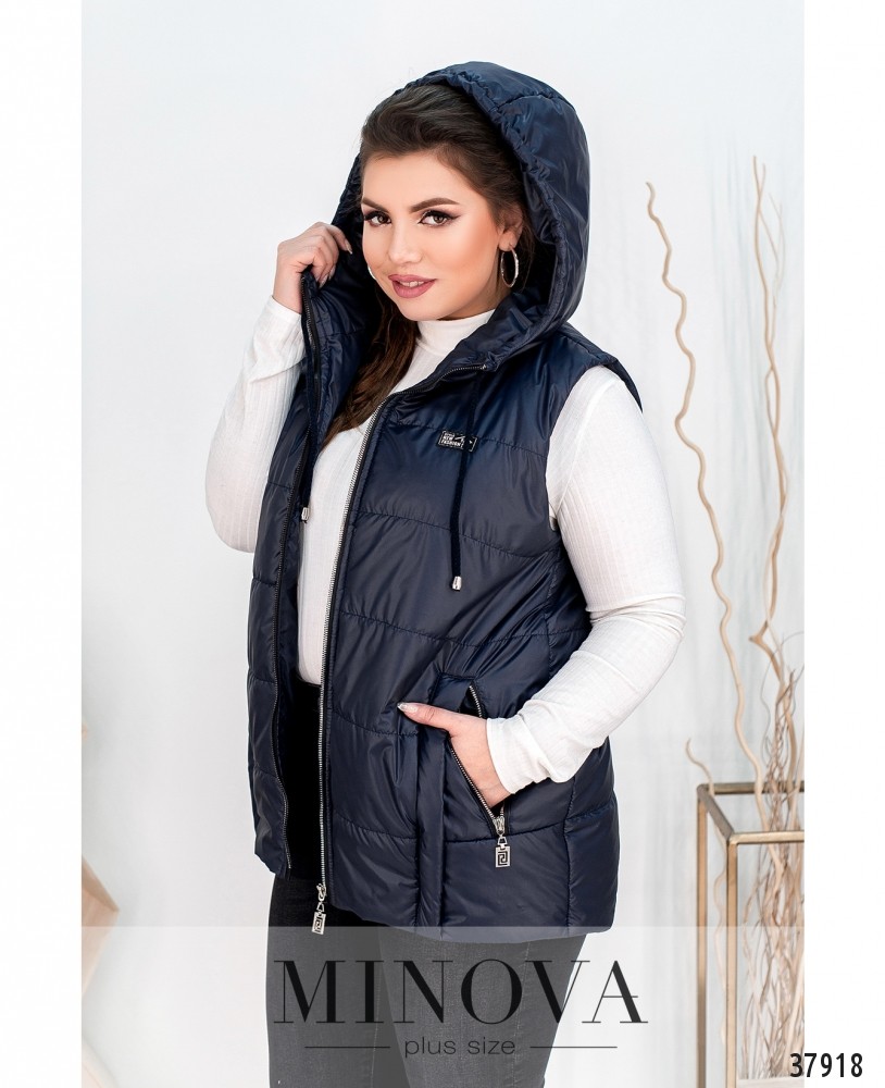 Стильная простёганная жилетка батал с капюшоном и врезными карманами по бокам. На левой стороне груди – небольшая декоративная нашивка. Застёгивается на молнию, расположенную по центру. С подкладкой.