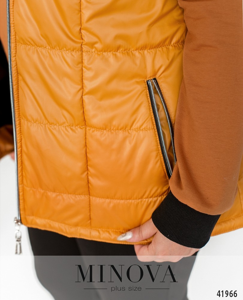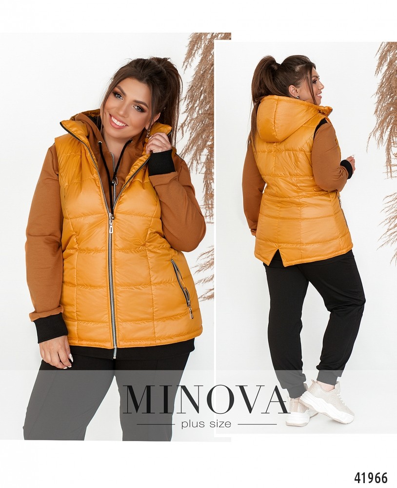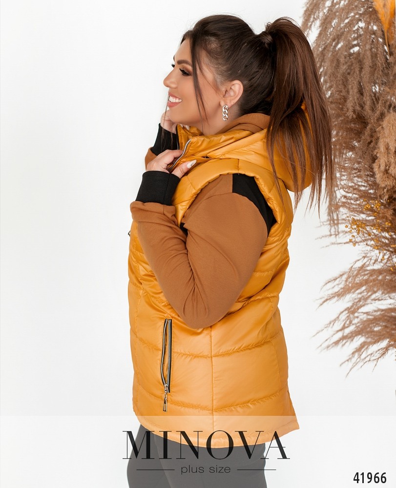 Удобный жилет большого размера с подкладкой, с капюшоном и врезными карманами по бокам, скрытыми под молнией. Жилет застёгивается на молнию по центру. Капюшон пристёгивается на молнию.