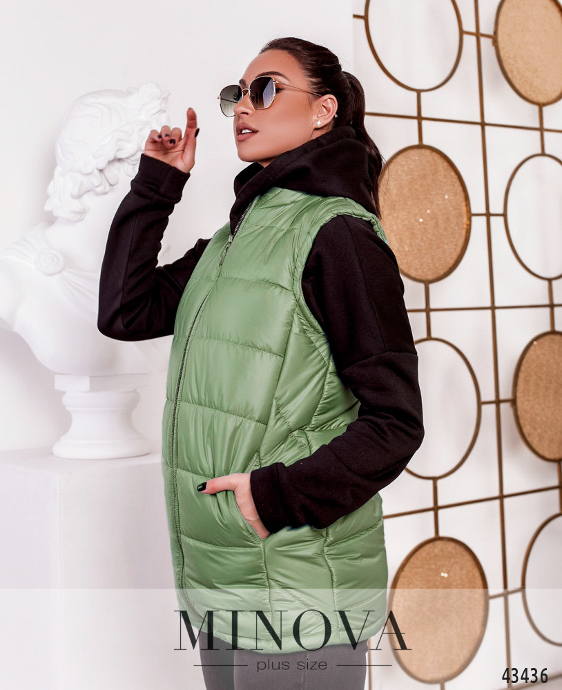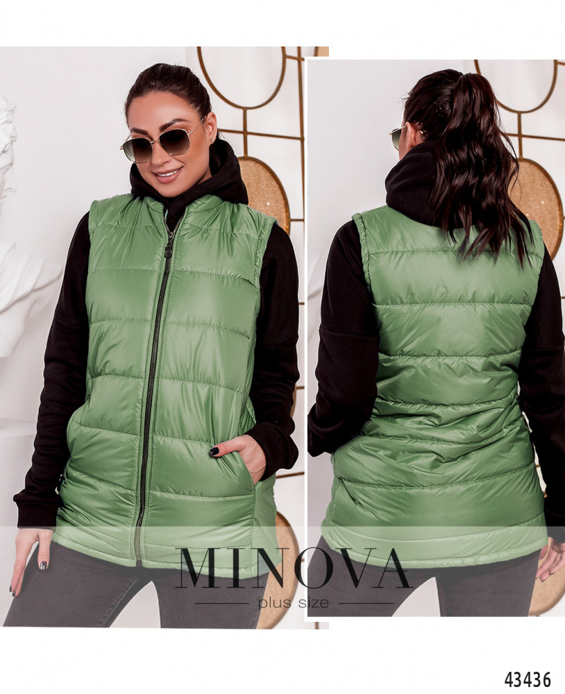Тёплый и стильный жилет большого размера, с подкладкой, застёгивается на молнию спереди по центру. По бокам - врезные карманы. Ткань простёгана. Жилет без капюшона.