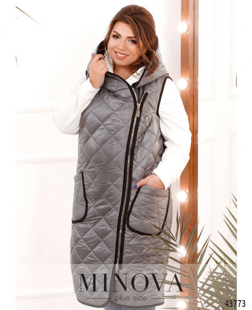 Стильный жилет большого размера с яркой подкладкой, ткань простёгана. Жилет с капюшоном, с накладными карманами и диагональной молнией; под ней - ткань, которая защищает от ветра. Капюшон не отстёгивается.