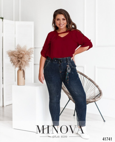 Стильные джинсы батал с высокой посадкой, врезными карманами по бокам и накладными - сзади на бёдрах. Через пояс пропущен шнурок, вшита резинка, спереди - декоративная ширинка. Застёжек нет. В комплекте украшение. Украшение входит в комплект.