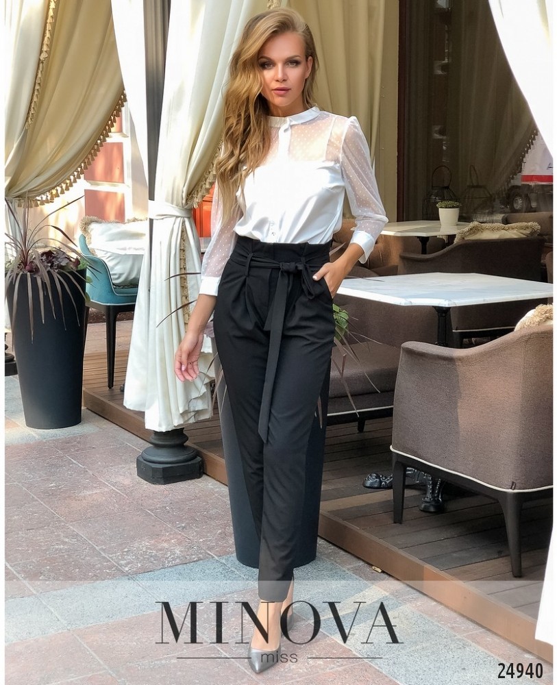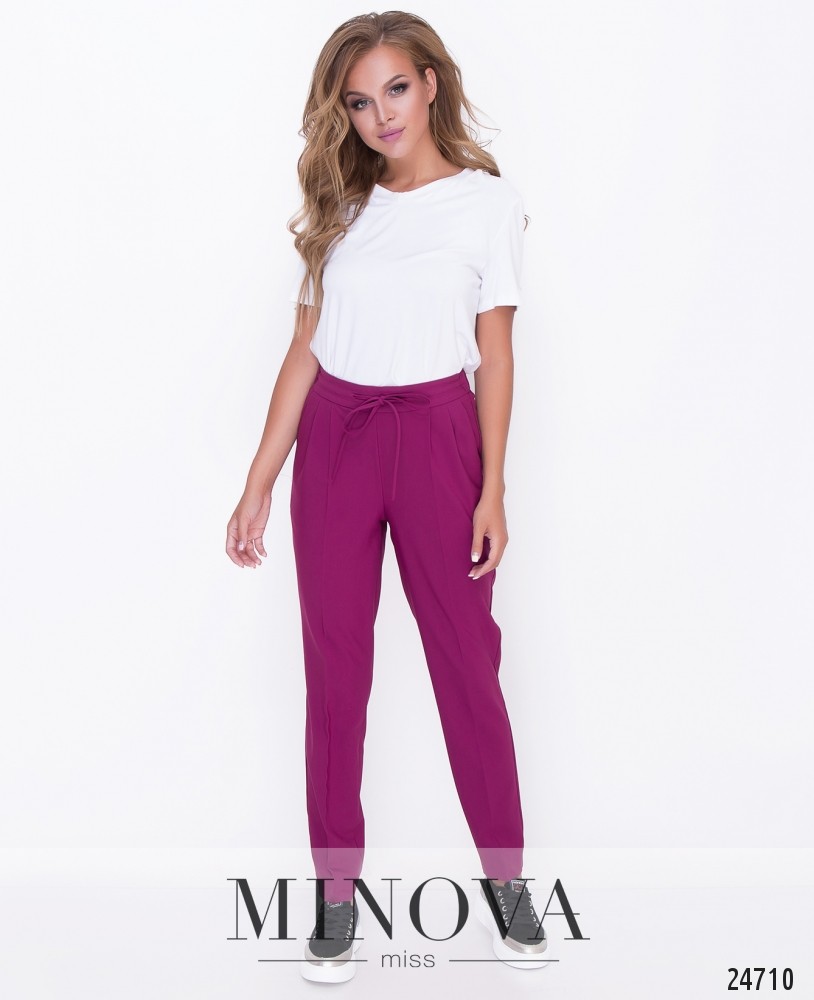 Трендовые зауженные брюки с карманами и пояском, дополнены защипами на лицевой стороне и широкой линией пояса. Низ брюк дополнен манжетом.