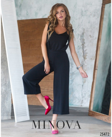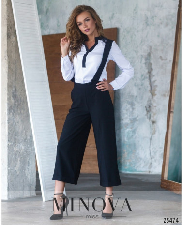 Стильные брюки-кюлоты на высокой талии с отстегивающимися шлейками. Брюки с карманами и манжетами. Скрытая молния находится сбоку. На лицевой и задней стороне шлейки застегиваются на внутренние пуговицы.