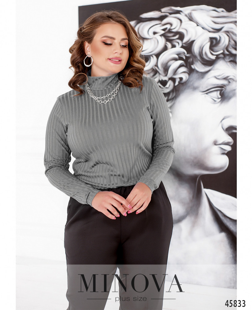 Лаконичный гольф, выполненный из эластичного материала с легким мерцанием, можно носить как самостоятельную единицу или комбинировать с сарафанами, кардиганами и жилетками. Горловина этой модели дополнена защипами и вертикальной планкой, вытягивающей силуэт.