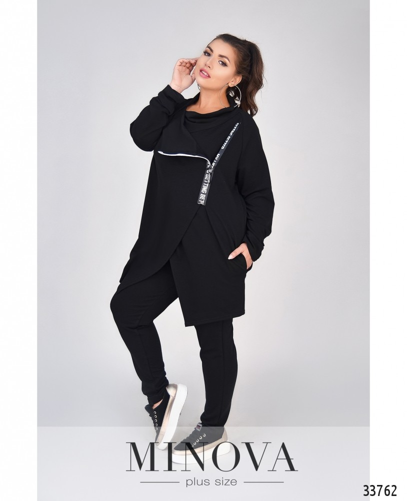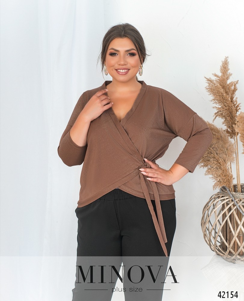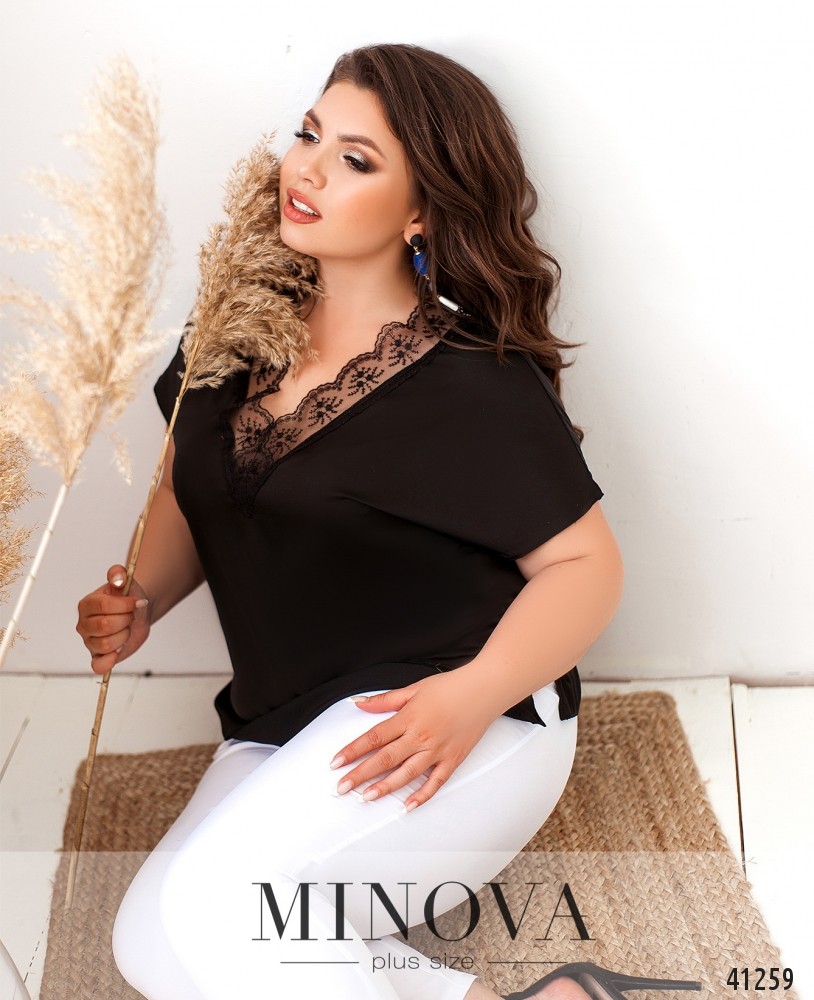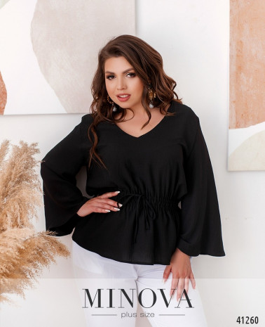 Стильная блуза батал с V-образным вырезом горловины, рукав - свободный колокол от плеча. В пояс вшита резинка и шнурок, подол асимметричный, застёжек и карманов нет.