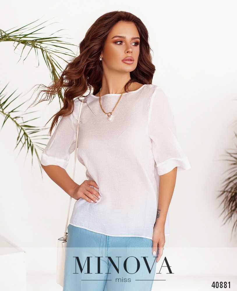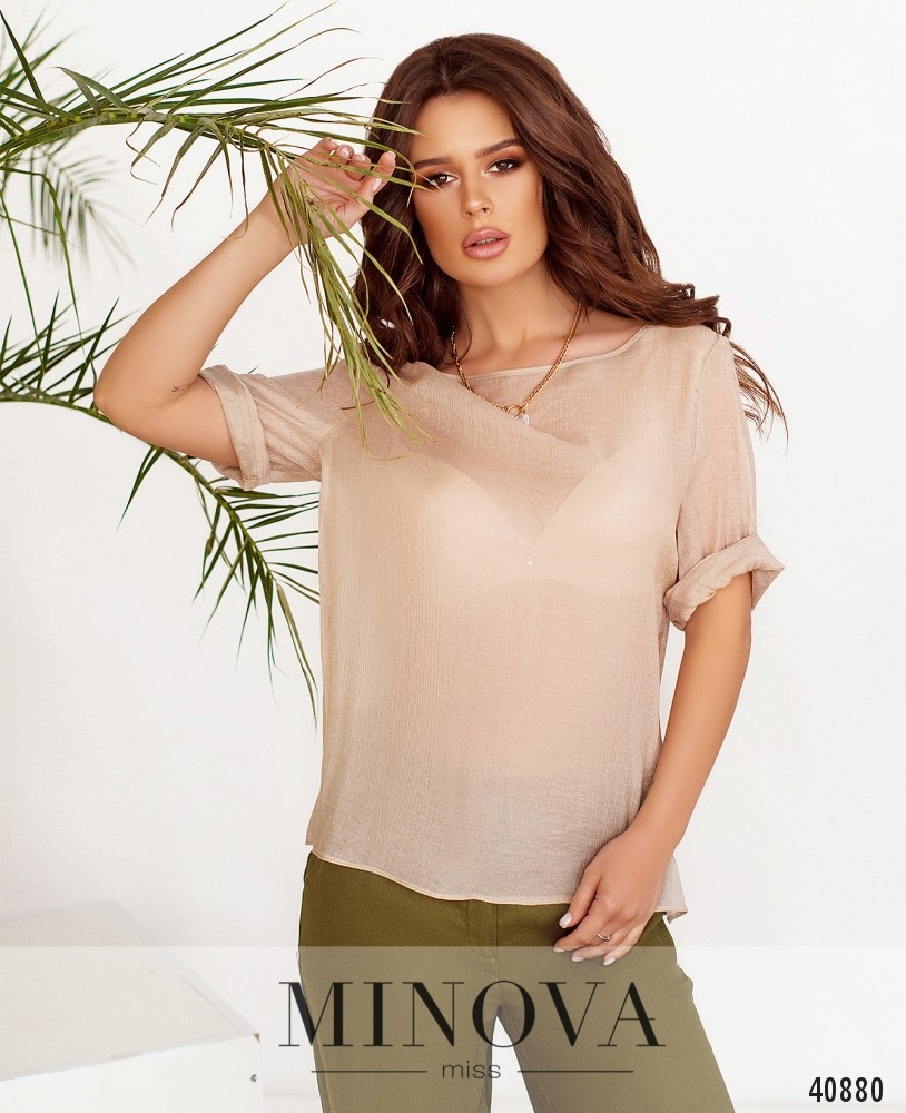 Лёгкая, воздушная, полупрозрачная блуза без застёжек и карманов, с небольшими отворотами на рукавах, вырез горловины "лодочка".