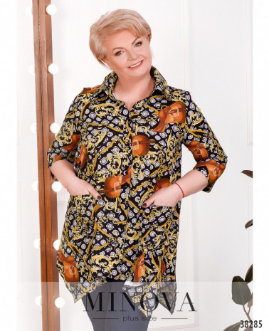 Чепурна сорочка-туніка великого розміру з яскравим принтом. Комірець відкладний, спереду – ряд гудзиків на планці. Рукава з широкими манжетами без гудзиків, поділ з боків довше. Спереду – нашиті накладні кишені. Принт прикрашений блискітками.