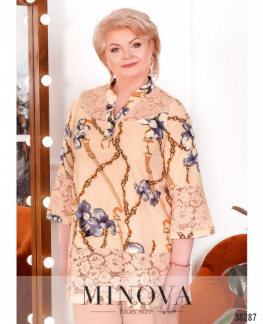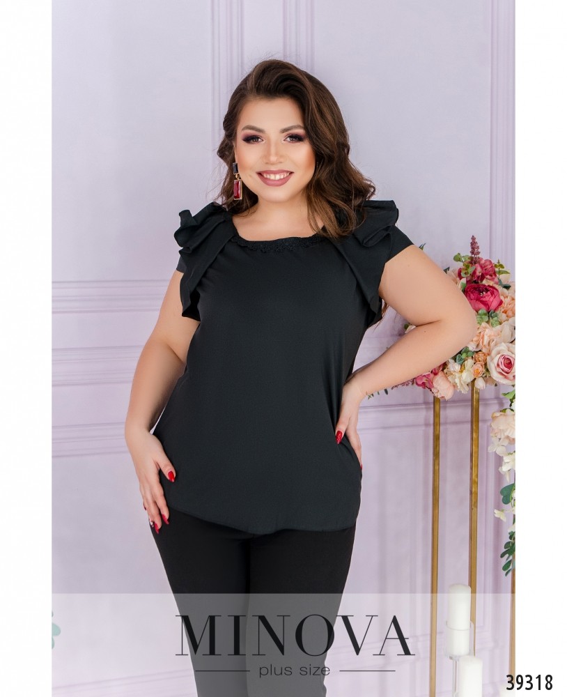 Приваблива блуза батал з рукавом-воланом, виріз горловини \"човник\", прикрашений тонким мереживом спереду. Крій вільний, кишень та застібок немає.