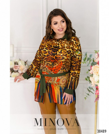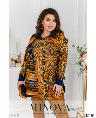 Яскрава та дуже приваблива сорочка-туніка великого розміру з чепурним принтом спереду та однотонною спинкою. Сорочка з відкладним комірцем, застібається на повний ряд гудзиків на планці спереду, з боків - підшитий поясок. На рукавах - невеликі манжети з невеликими гудзиками. Кишень немає. З боків на подолі - невеликі розрізи.