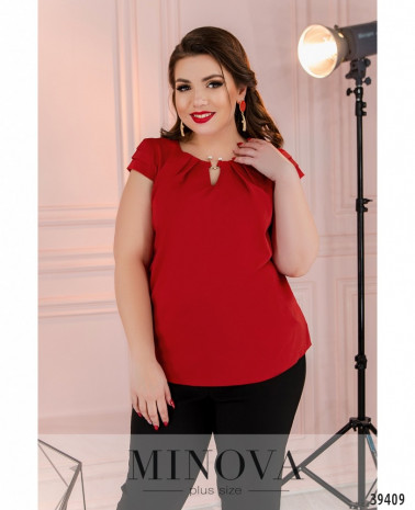 Стильна сорочка батал з невеликим жабо спереду, комірець - невелика стійка, застібається на один гудзик, під ним - неширокий виріз. Рукава короткі, кишень немає.