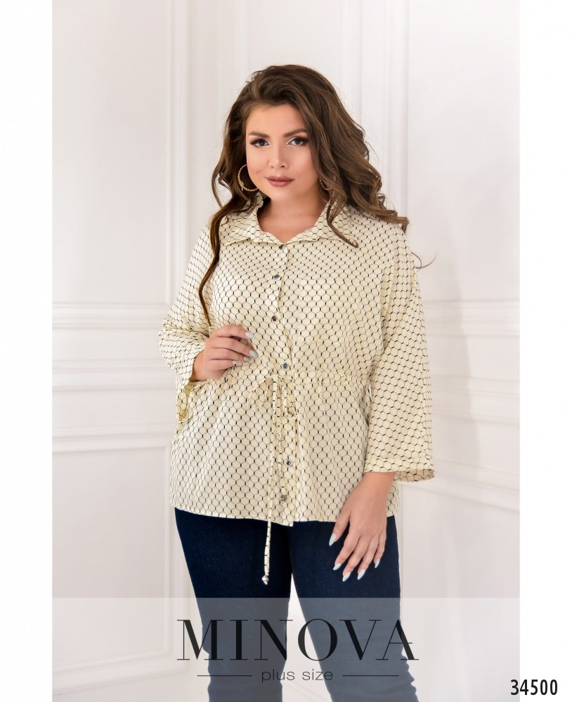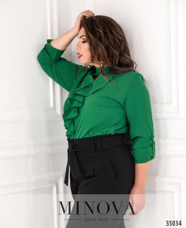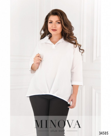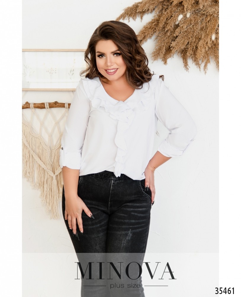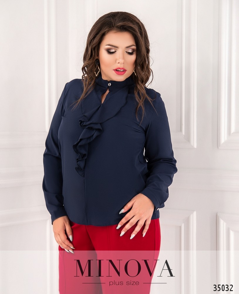Очень привлекательная блуза батал свободного кроя с небольшим жабо сделает ваш деловой образ более нарядным, оставляя его в рамках приличий. Minova представляет модели блузок из лёгкой ткани, с рукавами полной длины, которые можно регулировать с помощью ленты и пуговки. На рукавах – небольшие манжеты с пуговками. Карманов нет. Воротник-стоечка, застёгивается на одну пуговицу с петелькой. Прекрасный вариант на каждый день или на праздник, можно сочетать с джинсами или с брюками. Выбор аксессуаров – на ваше усмотрение, можно подбирать в тон или контрастного оттенка.