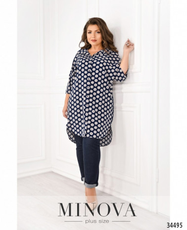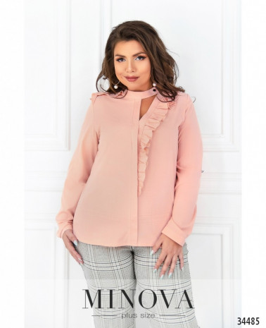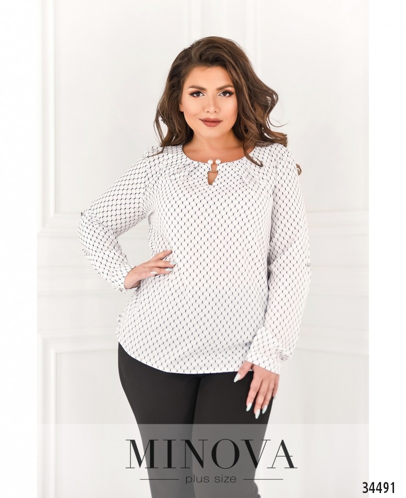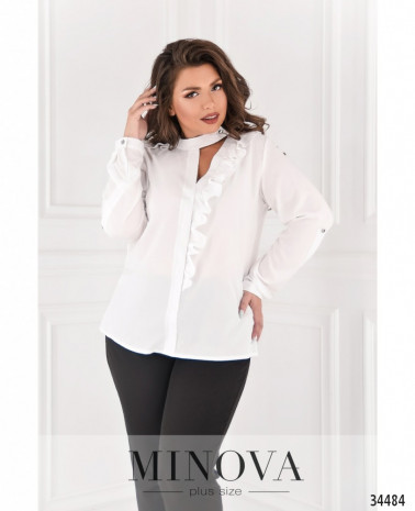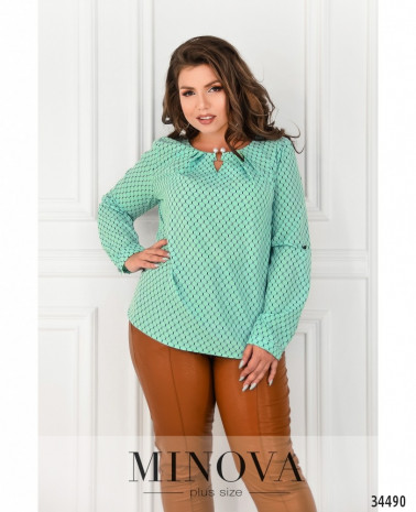 Очень лёгкая рубашка из «дышащей», приятной к телу ткани, представлена в каталоге Minova в четырёх оттенках: пастельных, тёмных и очень ярких. Рубашка классического фасона: отложной воротничок, полный ряд блестящих пуговиц на ножке, рукава полной длины с манжетами, украшенными одной пуговкой. В комплекте прилагается очаровательная брошь в виде подвески с бантом. На груди – небольшие диагональные вытачки. И самое интересное: две поперечные ленты, расположенные на спине на уровне кокетки. Эти ленты позволяют отнести рубашку к стилю спорт-шик, а значит, её можно носить не только с деловым нарядом, но и с удобными джинсами или юбкой, и сочетать с любой обувью.