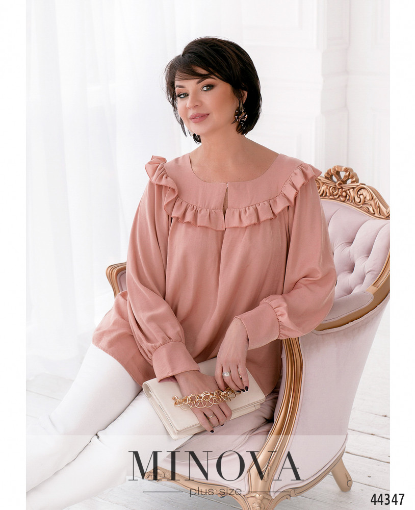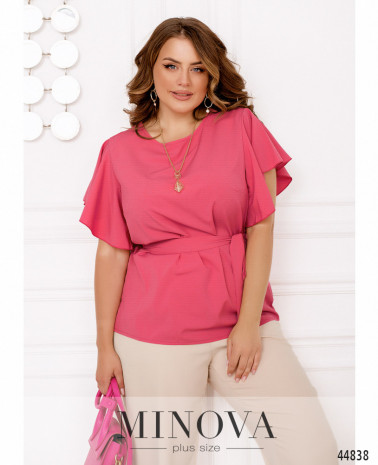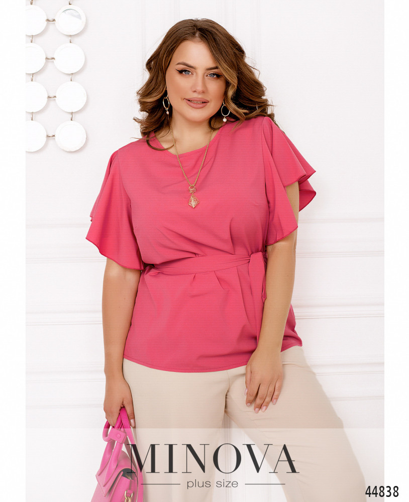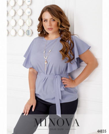 Элегантная и минималистичная блуза плюс сайз с рукавами-крылышками, ниспадающими мягкими оборками. На груди вытачки, застёжек и карманов нет, вырез горловины полукруглый. На талии по бокам подшиты шлейки для пояса.