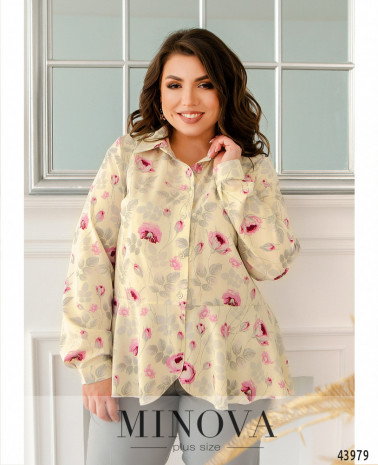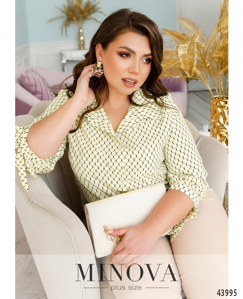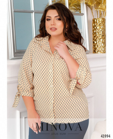 Нежная блуза батал с привлекательным принтом, на груди вытачки, рукава с мягкими манжетами, которые завязываются как ленты. Воротничок отложной, спереди - ряд пуговиц на планке. Карманов нет.