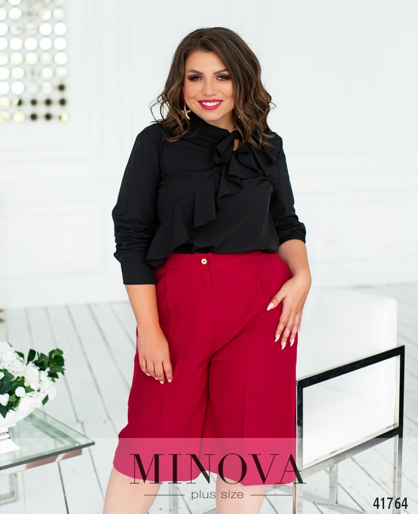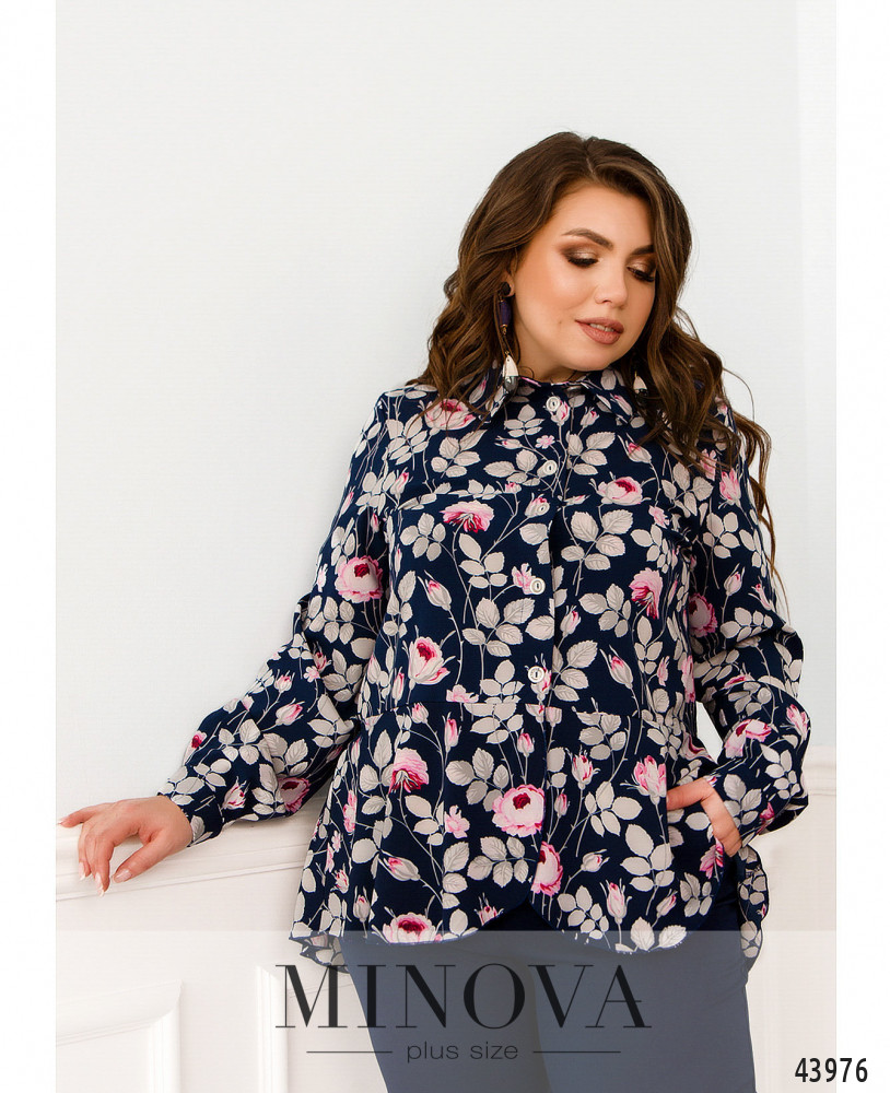 Элегантная блуза батал с нежным принтом, воротничок отложной, спереди - ряд пуговиц на планке. Рукава с манжетами, на манжетах по одной пуговке. Снизу к подолу подшиты мягкие оборки. На груди вытачки. Карманов нет.