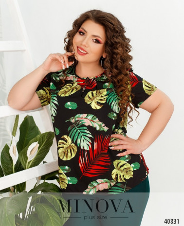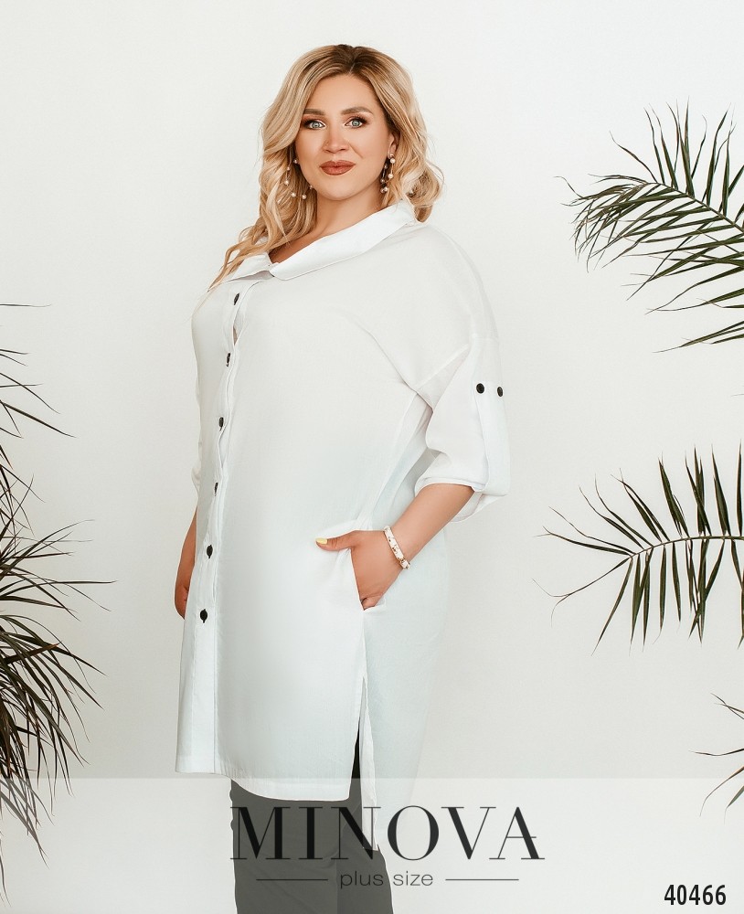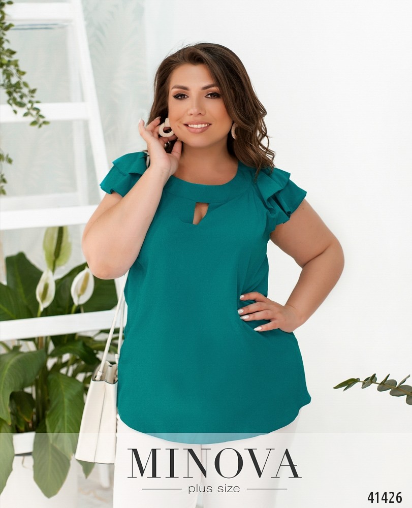 Чепурна та оригінальна блуза великого розміру з півкруглим вирізом горловини, під ним - гудзики з петельками та декоративні оборки. Рукава без манжетів, кишень немає.