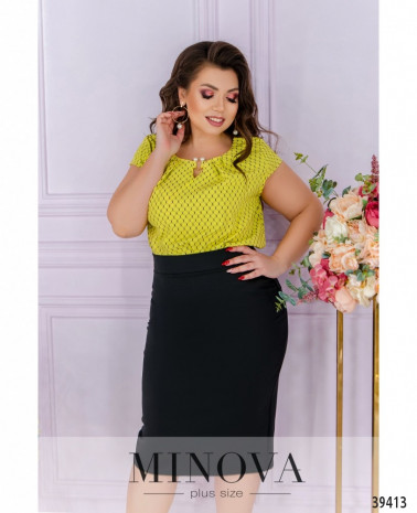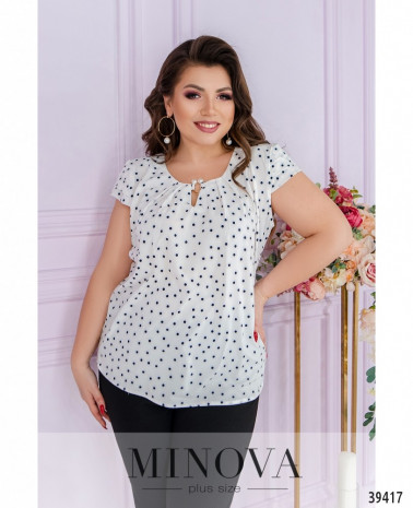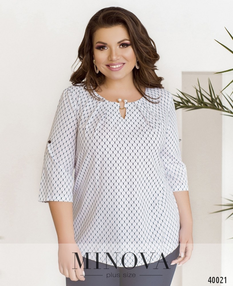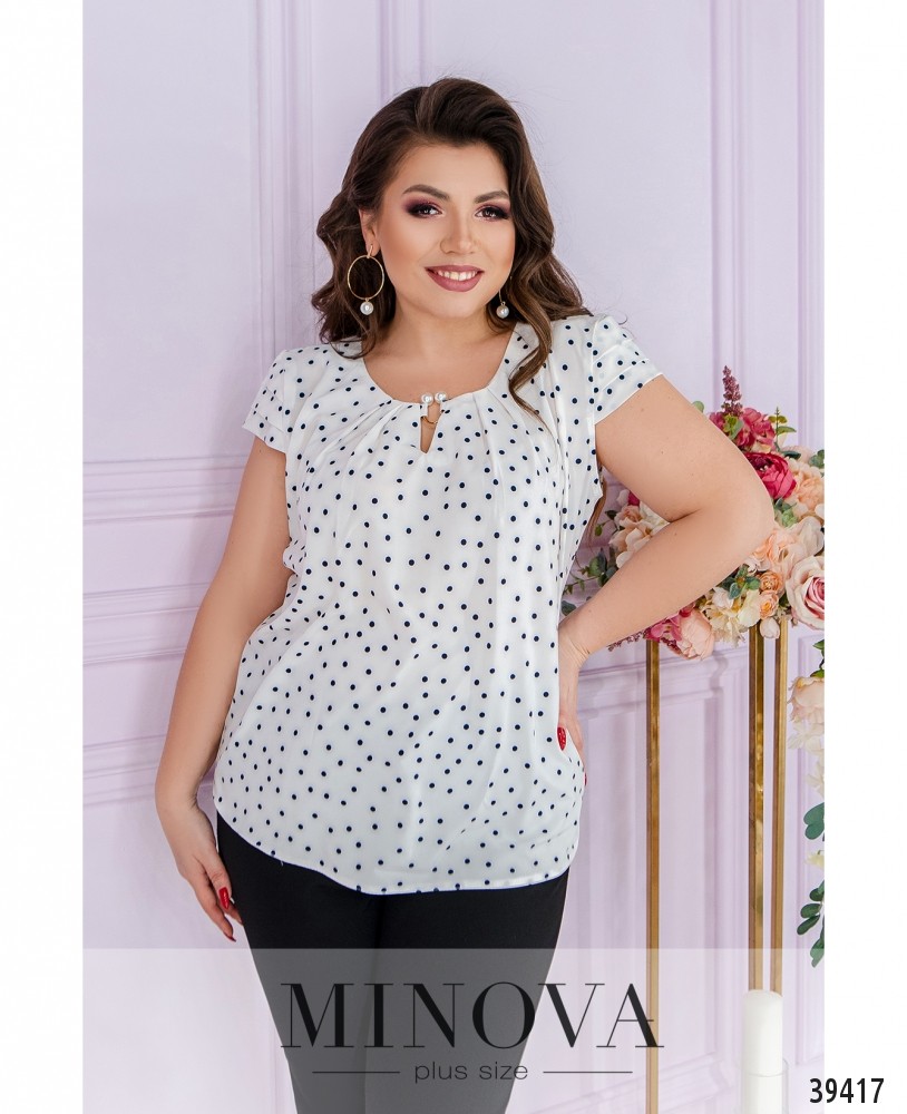 Стильна блуза великого розміру з півкруглим вирізом горловини, через виріз пропущено золотистий декоративний елемент з \"перлинними\" набалдашниками. Рукава регулюються на гудзик та стрічку. Тканина під вирізом горловини призібрана декоративними складками. Без застібок і кишень.