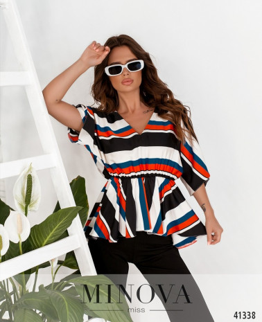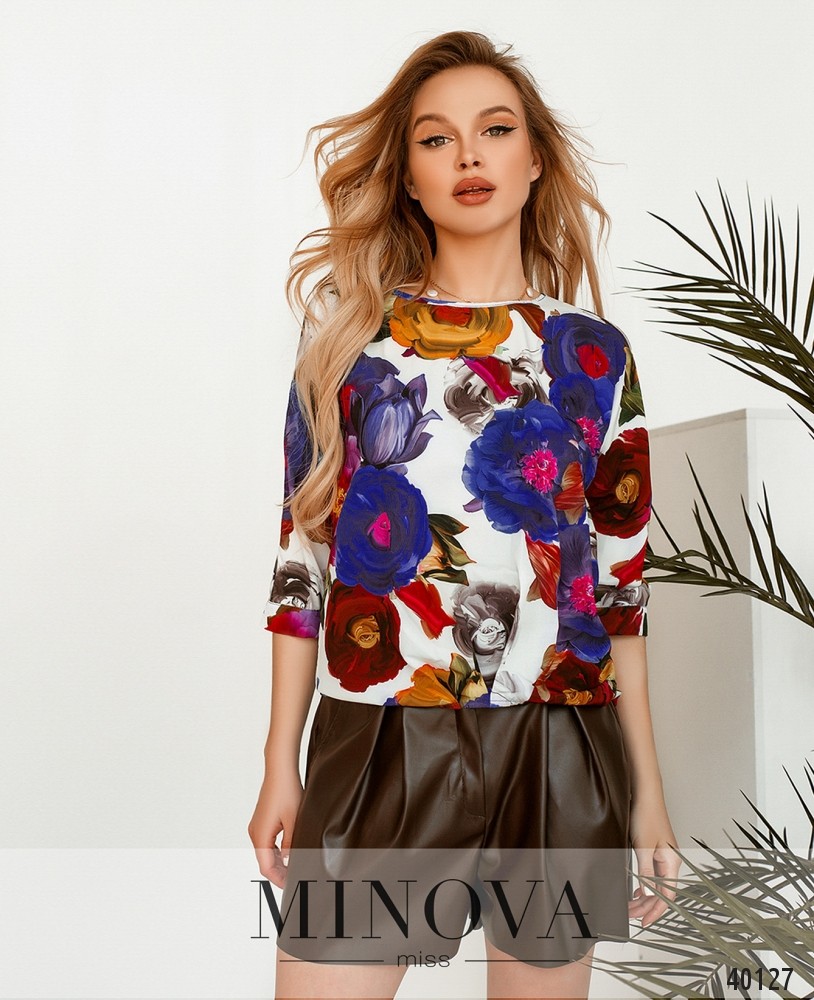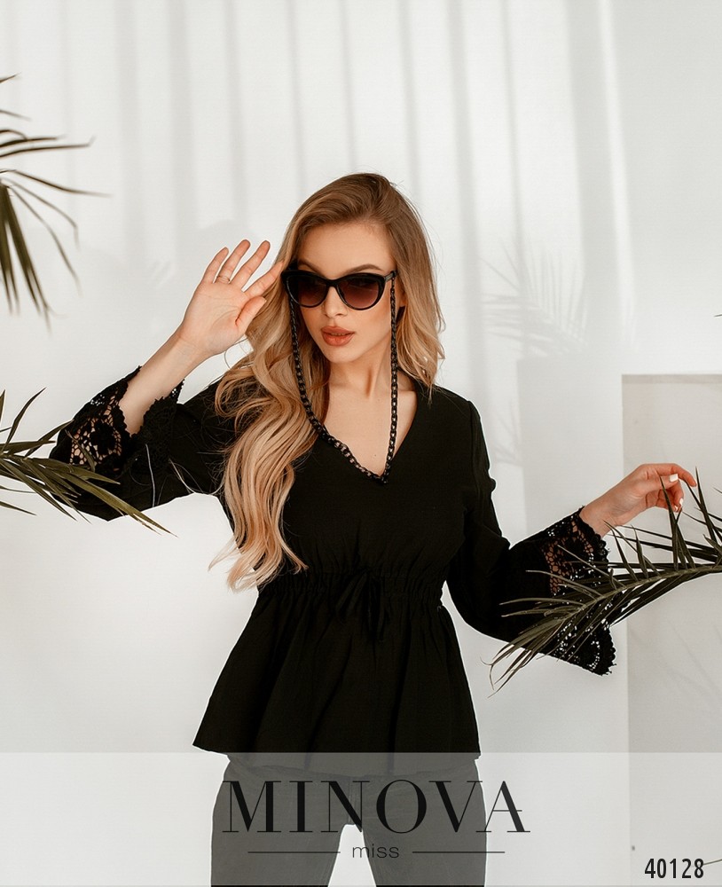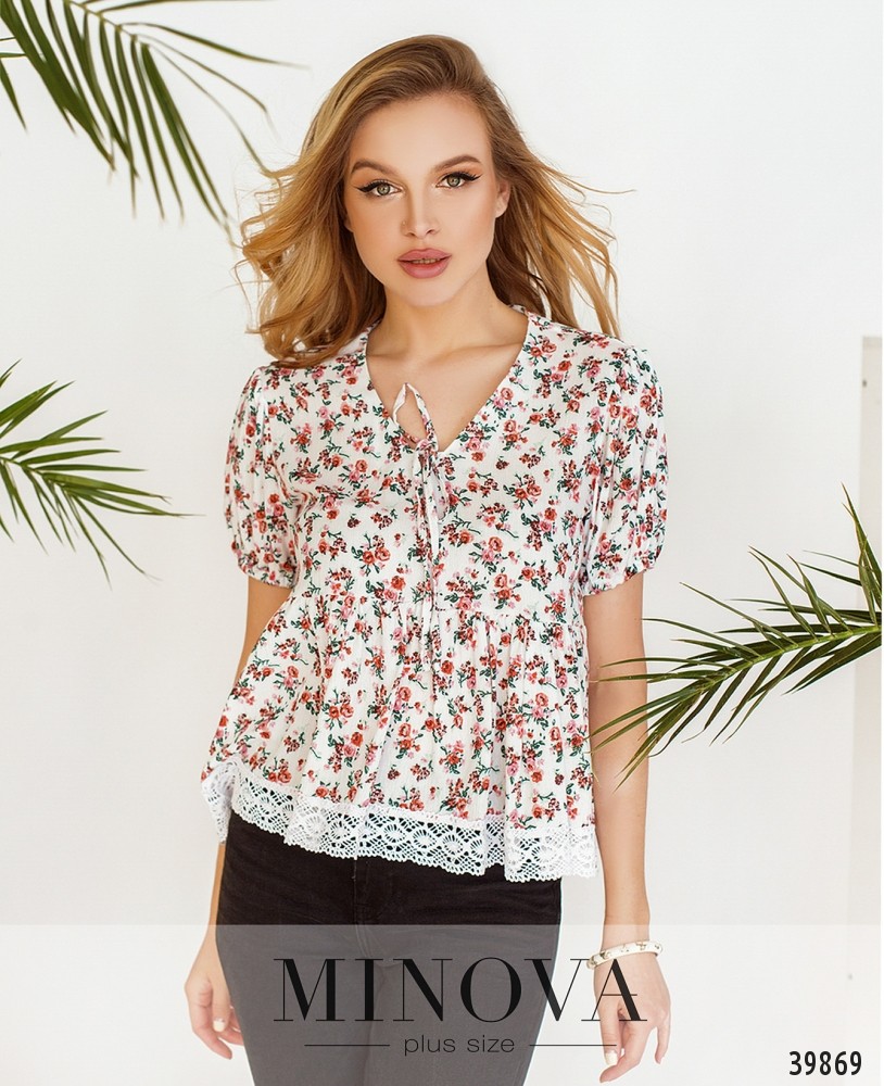 Нежная блузка с цветочным принтом, подол присобран на резинку, украшен кружевом. Рукава-фонарики, в них вшита резинка. Вырез горловины неглубокий, с завязками. Застёжек и карманов нет.