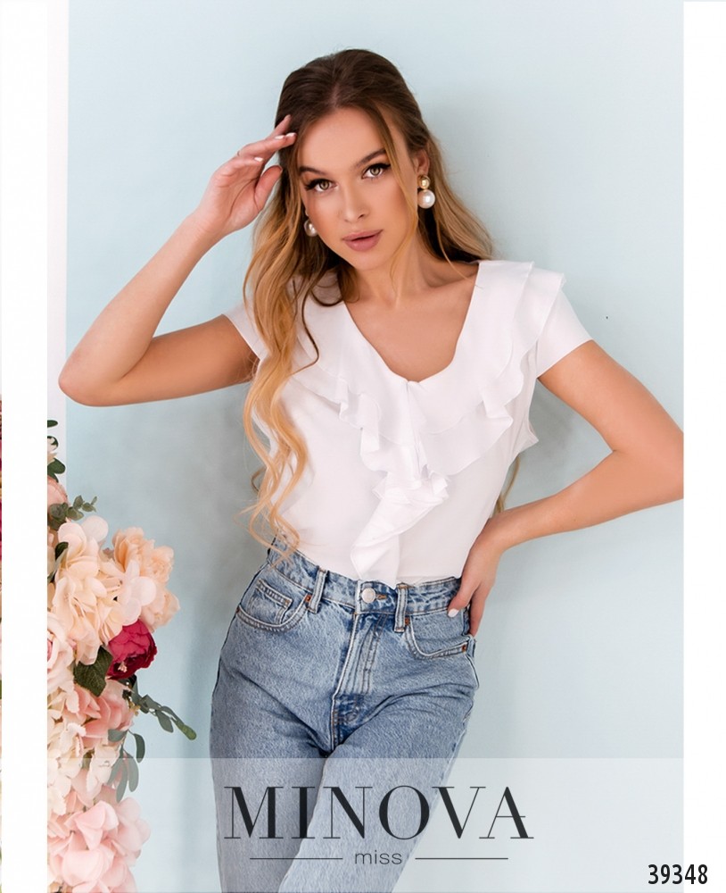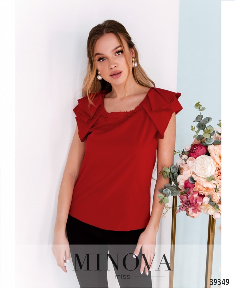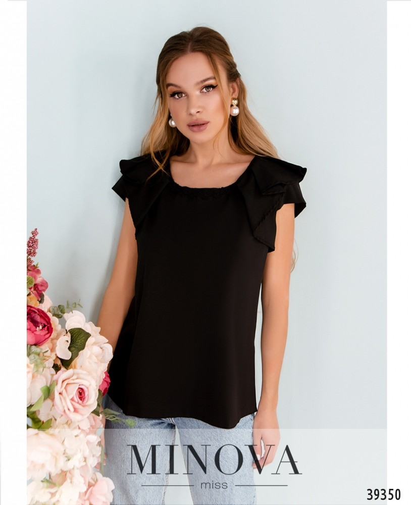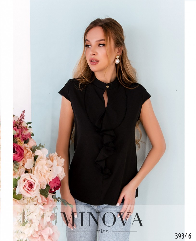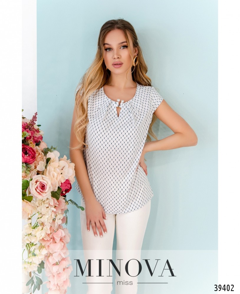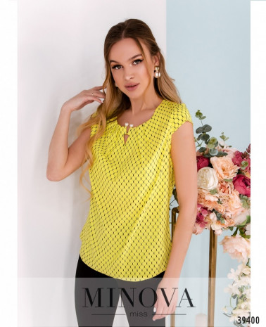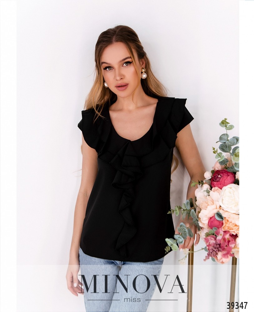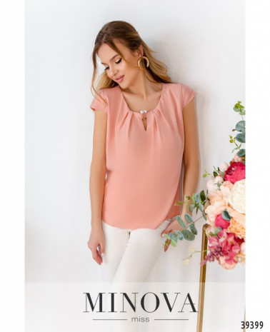 Элегантная минималистичная блуза плюс сайз с рукавом-лепестком, вырез горловины полукруглый, украшен золотистой "подковкой" с "жемчужными" бусинами. Ткань спереди присобрана, карманов и застёжек нет.