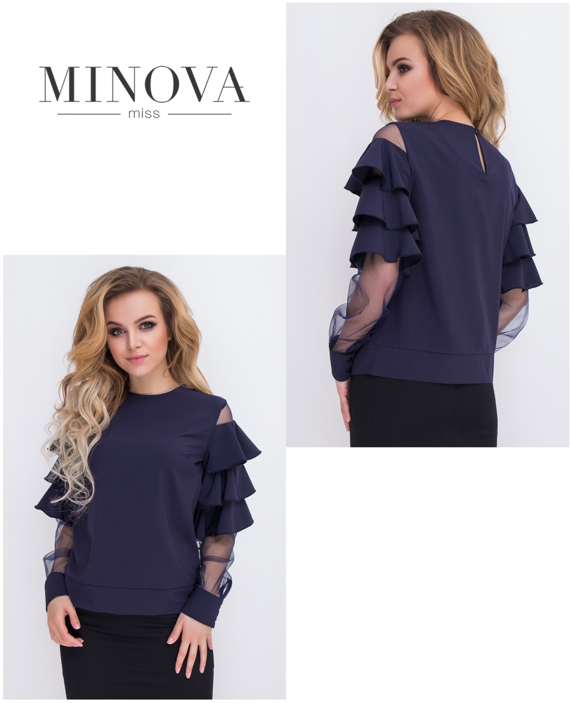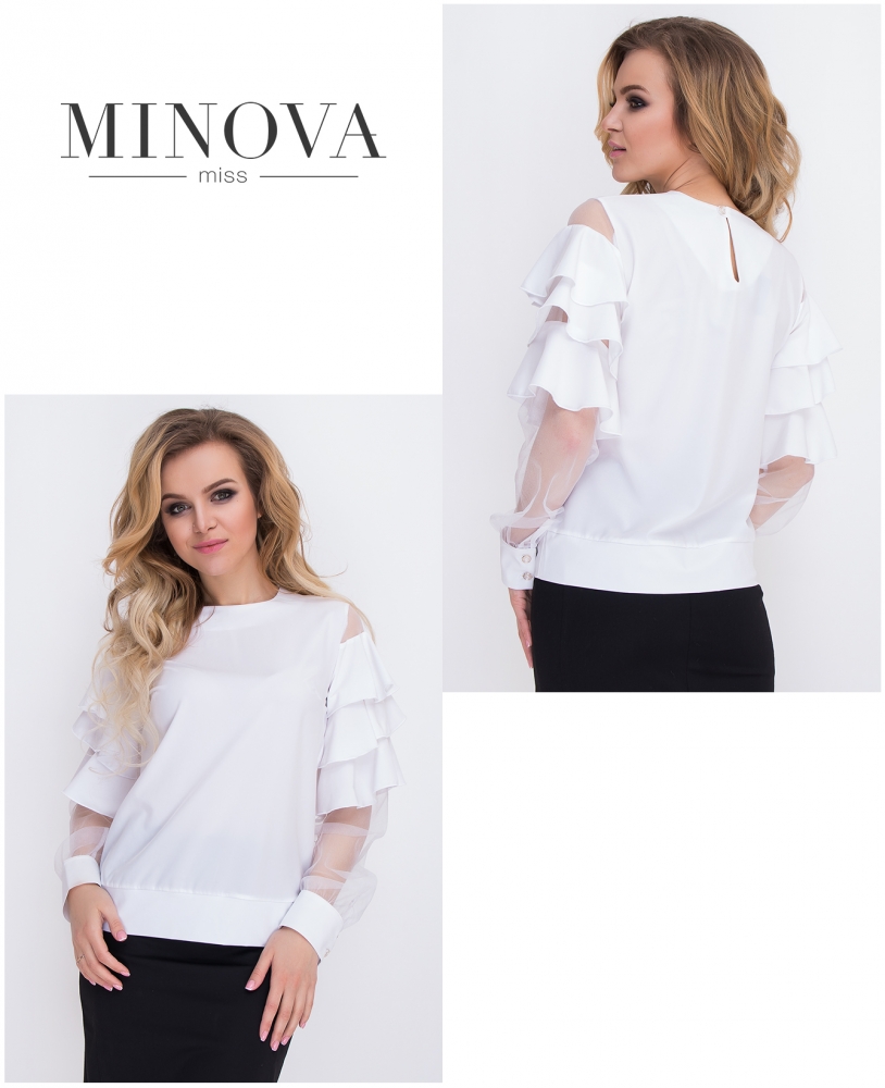 Элегантная блуза с прозрачными рукавами и плечами. Длинные рукава выделены манжетами на пуговицах и дополнены объемными воланами. Подол собран на планку. На спинке горловина застегивается на пуговицу.