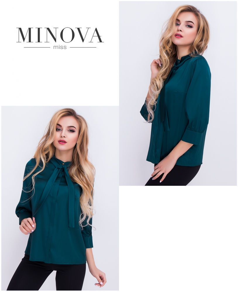 Шелковая прямая блуза с бантом и планкой, рукавами ¾ на пуговицах и расклешенной спинкой. На воротнике спереди и сзади есть пуговицы.