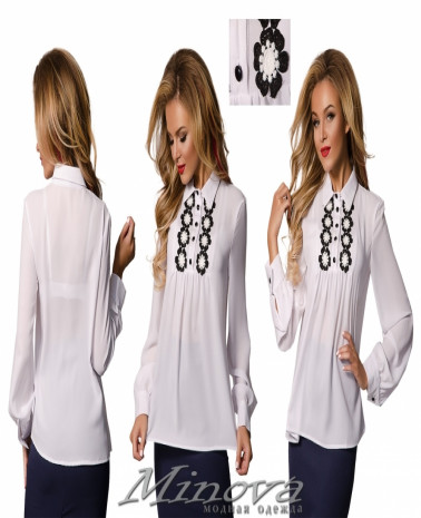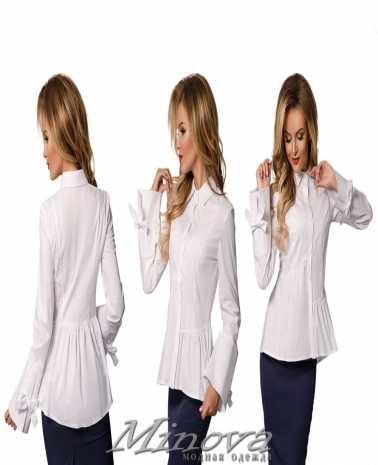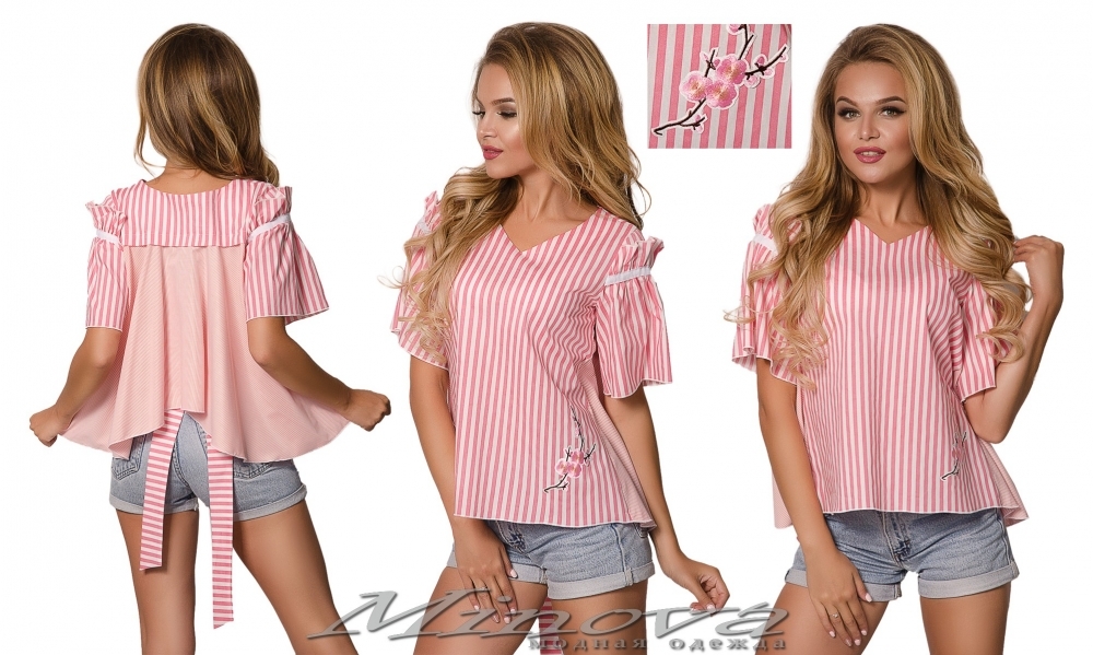 Романтичная блуза с V-образным вырезом и короткими рукавами-воланами. Рукава дополнены декоративным кантом. Спинка изготовлена в виде драпировки от полочки. Внутри пришиты две ленты, которые завязываются на спинке под блузой.