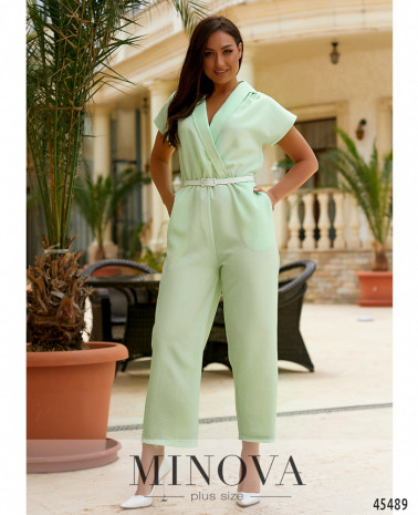 Минималистичный и очень привлекательный комбинезон с закрытым передом и спинкой, без рукавов, по бокам - врезные карманы, застёгивается на вшитую по спинке молнию. Брюки расклешённые. На груди - скульптурирующие вытачки. Пояс входит в комплект.