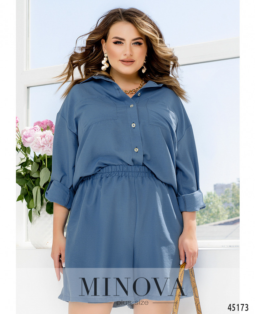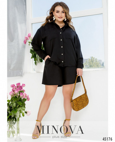 Яскравий контрастний костюм з блузою-тунікою і темними брюками допоможе створити незабутній елегантний образ. Подовжена приталена блуза-туніка насиченого кольору з V-подібним вирізом, нагрудними накладними кишенями і короткими рукавами з манжетами є виразним акцентом в даному костюмі. Її ідеально доповнюють мінімалістичні темні штани на резинці. І блуза, і штани доповнені кишенями в бічних швах для вашої зручності.
