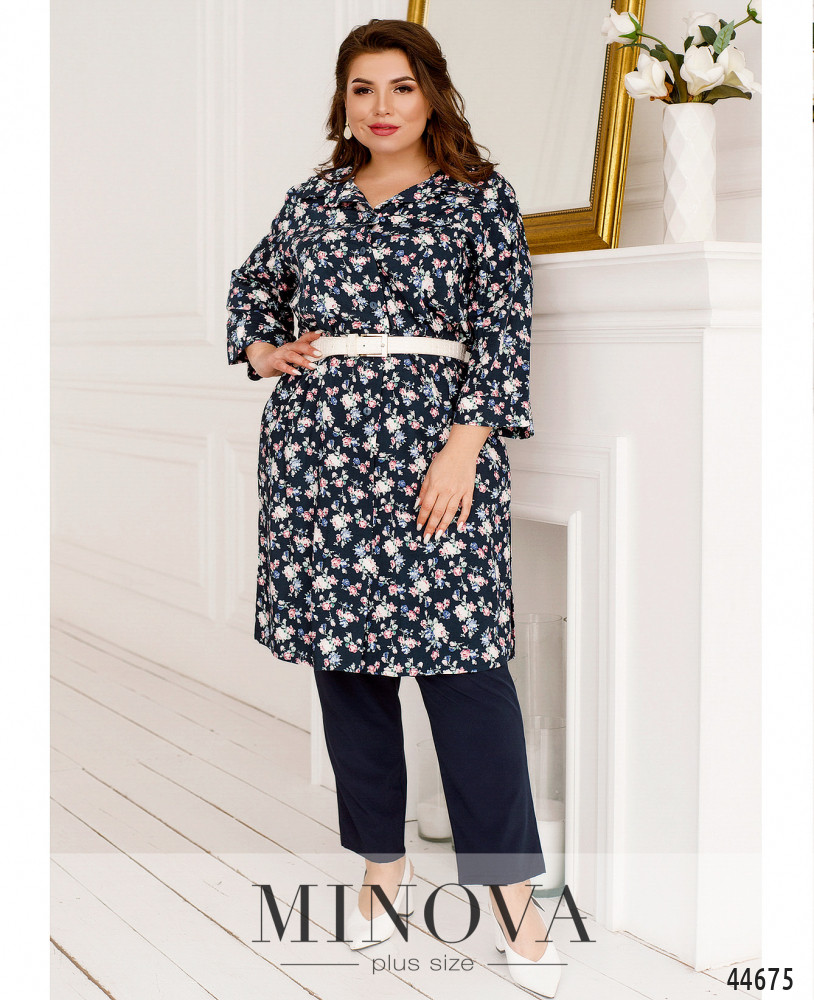 Оригинальный и привлекательный костюм большого размера. Рубашка с шлейками для пояса на талии, воротничок мягкий отложной, рукава без манжет, подол асимметричный, по бокам длиннее. Застёгивается на ряд пуговиц спереди на планке. Брюки с высокой талией, в пояс вшита резинка, по бокам - карманы в шве, застёжек нет. Пояс/аксессуар входит в комплект.